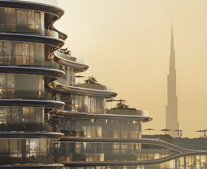 The architectural design is a graceful homage to the fluidity of water — a façade that dances with light, blending sinuous curves and modern aesthetics.
