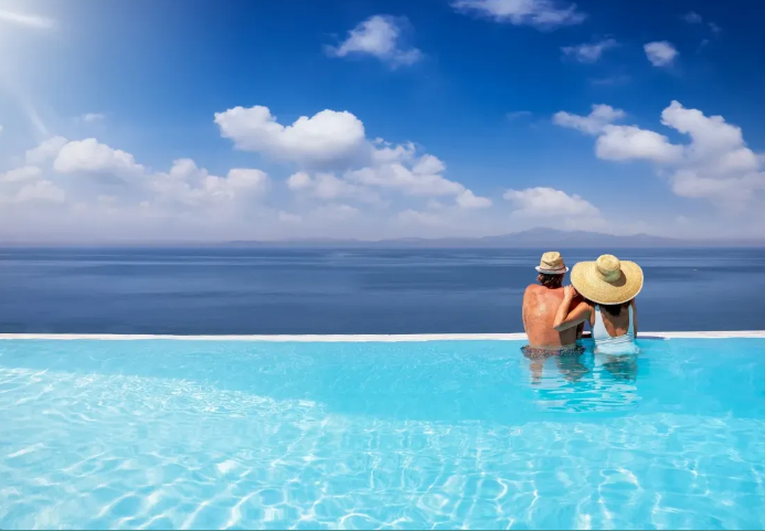 • Large swimming pools, including an infinity pool; sun‑loungers, daybeds & cabanas. \